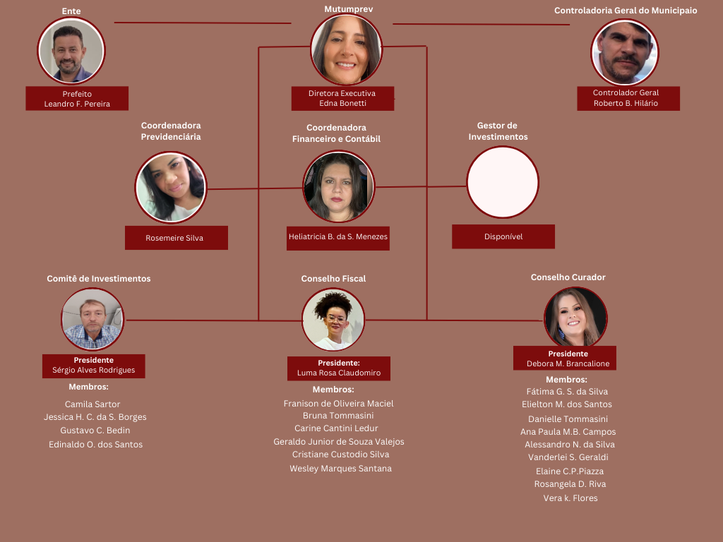 Representação visual da estrutura organizacional do Mutumprev. Finalidade em descrever sua organização interna a nível de cargos e departamentos.